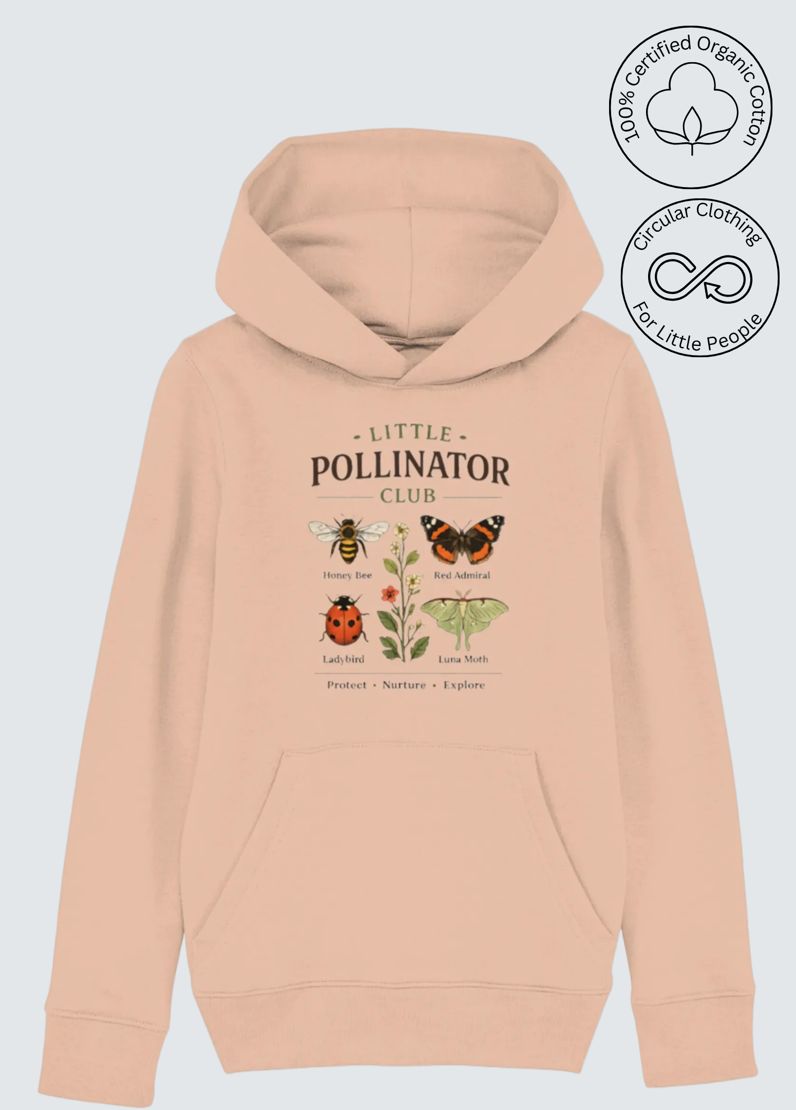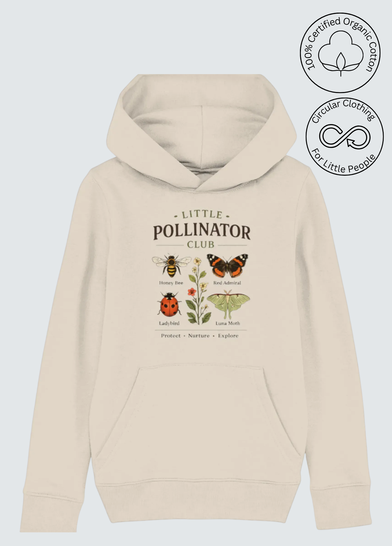 Crafted from soft, organic cotton , this hoodie is gentle on delicate skin while being kind to the planet. Medium weight yet cool for summer evenings outdoors.  The design is inspired by bees, butterflies and pollination, inviting little ones to feel connected to nature and proud to be part of...